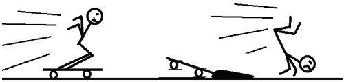 Inércia no skate: Segundo a primeira lei de newton, uma massa em repouso tende a permanecer em repouso (que é o equilíbrio estático) e uma massa em movimento retilíneo e uniforme (MRU) tende a permanecer em MRU (que é o equilíbrio dinâmico). O skate e o skatista são constituídos de matéria, logo têm massa, que é a medida da inércia deles, isto é, é a medida da resistencia que eles tem para variar a sua velocidade.